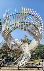 The sculpture, completed in 2011, is the creation of the architect Nuru Karim and colleagues. Consisting of two closely placed spirals, it rises to a height of 11 metres. The spirals are formed using a set of triangular frames made of a type of Tata steel alloy.