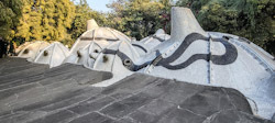 Next door to CEPT University in Ahmedabad much of which was designed by Doshi, there stands Doshi’s most unusual edifice, the Amdavad ni Gufa (the Ahmedabad Cave), which was completed by 1990. Its is difficult to describe this structure, but I will try. Covered in a mosaic of black and white ceramic tiling, it resembles an enormous caterpillar partially submerged in the ground. It is a giant caterpillar punctuated by bulbosities of various sizes, some of which have hemispherical windows at the end of short stalks that project from the dome-like bulbosities.