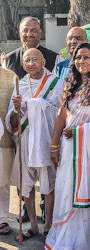 Residing in the USA, this Gandhi impersonator has attended many Indian patriotic ceremonies. To date, he has appeared in 35 in the USA and about 60 in Ahmedabad. His presence was a huge success. Everyone wanted to be photographed alongside him. With his sturdy staff in one hand, he held his mobile phone in the other. Had they been available, I wonder whether the real Mahatma would have been happy to use one.