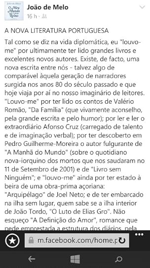 Ovar, o FLO, o Festival Literário de Ovar, o primeiro, este de 2015, foi um momento singular em que me deixei estar naturalmente entre os grandes, mas quase não quero falar aqui de competências literárias, embora queira falar de memória e de presente. Gostava de falar da doçura e do respeito de senhores como Jaime Rocha, sublime poeta e marido da Hélia Correia, que eu idolatro e faço questão de idolatrar, entre outros, como o Miguel Real e o João de Melo, mas não só. Neste último caso, vi-me, nesse memorável jantar ovarense de escritores, noite alta, a ouvir a lucidez do João de Melo sobre a memória. Eu e ele, num troço da longa mesa e já na fase das migalhas, mas para mim no prato principal. Depois disso, sei que pediu os meus livros e os leu. Tive a honra de ouvir/ ler dele palavras que levarei para a sepultura (talvez até as grave na pedra tumular). Depois houve o dia em que ele me mencionou por escrito e publicamente, e isso para mim não passa. Tive esse dia cheio de comoção e "louvo-me" por ter podido conhecer e ser alvo das palavras do grande João de Melo, que se "louvou", e passo a citar, "por ter descoberto em Pedro Guilherme-Moreira o autor fulgurante de "A Manhã do Mundo" (sobre o quotidiano nova-iorquino dos mortos que nos saudaram no 11 de Setembro de 2001) e de "Livro sem Ninguém"; e esta menção vale quantos prémios vocês quiserem. Não o partilho porque me ache nada de especial. Partilho pela raridade e pela beleza do acto num dos grandes. Este homem, este meu ídolo, foi, por exemplo, o editor de Memória de Elefante e de Os cus de Judas, de um tal de Lobo Antunes, e também do Mário de Carvalho, entre outros. O que me comove é ter passado no crivo de quem já viu muito. E é tão bom que tenha voltado e continue a ver. (junto um printscreen parcial, porque a partilha não ficava visível para todos). Abaixo podem também ver o vídeo que substitui a minha intervenção principal em Ovar e que nos deixou a todos plenos, porque todos, quase todos, acreditam que a literatura (também) é isto: PG-M 2015