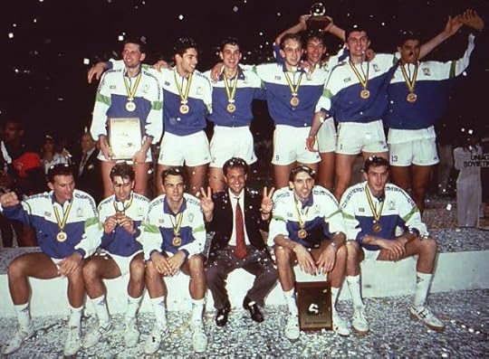 Já estamos há uns dez minutos no 15-14 para a Itália; naquele tempo, os pontos só se faziam no próprio serviço e a palavra "virar" tinha outro sentido. O tempo vai passando, não se falham serviços e os atacantes levam a melhor. Despaigne, poderoso, limpa tudo do lado de Cuba. Os blocos não estão a conseguir contrariar os melhores atacantes. Gardini e Lucchetta ao centro um par de vezes cada um, o oposto Zorzi, Cantagalli e Bernardi nas pontas. Zorzi remata para fora e desperdiça uma das poucas oportunidades em que Cuba não resolve por Despaigne logo ao primeiro ataque. Despaigne sai do ataque e vai servir. Quando só se marcavam pontos no serviço, o voleibol era mais desgastante para os atletas e para o público. Com Despaigne atrás, mais uma oportunidade da Itália, embora Despaigne seja um animal da segunda linha. Tofoli distribui e Zorzi remata contra o bloco, a bola sai e a Itália serve. O treinador-filósófo, como o amigo Dez-cartas, substitui o distribuidor Tofoli por Martinelli para o bloco, mas Luca Cantagalli falha o serviço. Paolo Tofoli volta a entrar. Bernardi recupera o serviço batendo uma bola limpa à diagonal curta, como quase todas as bolas de há dez minutos a esta parte. Só Despaigne, do outro lado, é impressivo, dá espectáculo. Os italianos são poderosos, rigorosos e eficazes. Cuba recebe e o distribuidor solicita Despaigne, claro, na segunda linha. Despaigne bate comprido para o fundo do campo, mas o central Lucchetta mergulha e salva a bola quase indefensável com o braço esquerdo - o próprio distribuidor Tofoli bate a bola de forma frouxa para o lado cubano, o distribuidor Tiago volta a insistir na segunda linha de Despaigne, mas o muro italiano de Bernardi e Gardini faz reflectir a bola para o lado cubano, que devolve ao segundo toque, Lucchetta recebe por cima, Tofoli levanta para Bernardi, Bernardi bate para o topo do bloco cubano, a bola sobe, sobe, sobe e vai cair longe. A Itália é campeã do mundo pela primeira vez: é o início da geração-fenómeno. O número 1, Gardini, doido de alegria, trepa à cadeira do árbitro, que gentilmente lhe pede para descer. Usará o cachecol de Portugal, por civilitá, vinte e cinco anos depois. Lucchetta dirá, mais tarde, que, ao levantar a taça, uma profunda tristeza se apoderou dele: afinal, o sonho de uma vida estava cumprido. E esse sabor de glória soube a um fim de linha. O mesmo para Bernardi, vinte e cinco anos depois. Mas a Itália é campeã do mundo de voleibol.