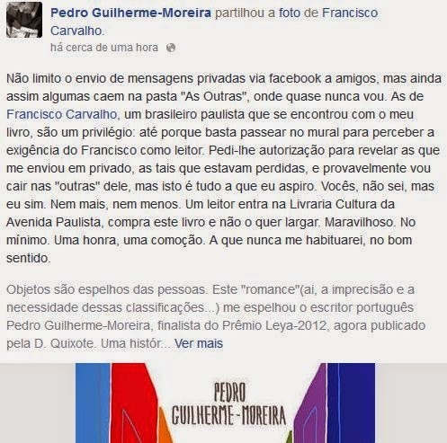 Começo pela Irlane carioca, porque a comoção do Francisco paulista vai ser contada toda por imagens.A Irlane segue-me em ambiente de blogue e facebook, e descobriu um post do ano passado que era uma ironia em tese política e social sobre o advento das redes sociais, olhando para o futuro e questionando o esvaziamento da palavra amigo, propondo, precisamente, "Inamigo". Ora, a Irlane pediu-me uma definição de inamigo para remessa ao projecto do Dicionário Informal, o que fiz. O notável neste duplo encontro (que aconteceu no mesmo dia por causa da pasta "As Outras", abaixo explicado) é a exigência, sabedoria e disponibilidade destes leitores. Como eu lhes disse, eu, mais do que escritor, sou servente de leitor. É o privilégio máximo ter pessoas assim perto de nós. E claro que isto acontece a muitos mais: mas, se acontece, que se celebre. Admiro muito leitores exigentes e dinâmicos, que não se deixam ficar no seu posto, que tentam chegar até nós: é a vantagem da contemporaneidade porque o resto são desvantagens. Como já muitas vezes disse, o textos deviam todos ficar a maturar cinquenta anos em casco de carvalho. Aqui fica a justa homenagem. A história do Francisco paulista vai contada pelas imagens do encontro, começando pelo meu post de hoje no facebook. Imagens com palavras, em vez de apenas palavras, para o coração aguentar :).