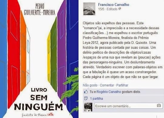 a rapariga tetraplégica que eu num conheço pessoalmente e é minha amiga no facebook (e bão ber como é falso o facebook!) e apaixonada por literatura porque, como ao Hernâni, a deixa conduzir sem parar, escreveu aquele comentário público num dia em que conseguiu estar desligada dos ventiladores, porque ela diz que é tão feliz quando o corpo lhe dá descanso e respiração e ela consegue escrever calmamente no facebook com aquela caneta de boca, e nesse dia resolveu dedicá-lo a mim, e não foi o comentário sobre o meu primeiro livro, A manhã do mundo, "Pedro, senti-me aquelas pessoas todas e morri feliz com elas a saltar das Torres, acreditas?", e eu só dizia "acredito, Margarida", mas só pensava, "como é que esta menina sem sorte decide que o bocadinho da semana em que não se sentiu sufocada é para me fazer um elogio a mim?", nem foi um comentário ao segundo, o Livro sem ninguém, quando me disse