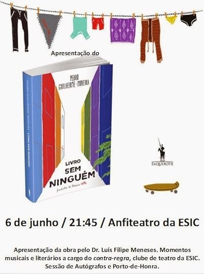 Todos os leitores deste blogue estão convidados a assistir gratuitamente ao espectáculo que será montado pelo grupo de teatro contra-regra em torno do "Livro sem Ninguém" - e que terá uma única apresentação amanhã,sexta, 6 de Junho de 2014, pelas 21:45h, no auditório da Escola Inês de Castro (parte nova), em Canidelo, Vila Nova de Gaia (em frente ao Golfe da Quinta do Fojo). O primeiro desafio é Luís Filipe Menezes falar de livros, e não de política. O segundo é o autor improbisar. Depois regressa Clarice Lispector e entra o contra-regra. A partir de pequenos excertos do livro haverá pretexto para cantar bossa nova, dançar tango (dançarinos profissionais)