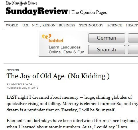 Oliver Sacks e os 80 anos. Quero ser assim quando crescer. (junto original do NYT - clicar sobre a foto abaixo, mas li-o no EL País, para quem preferir em espanhol)