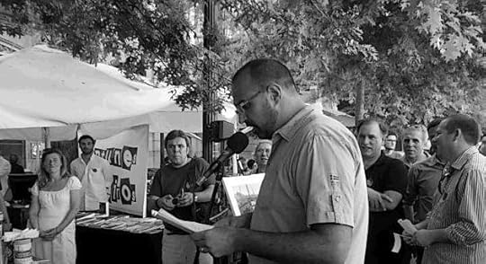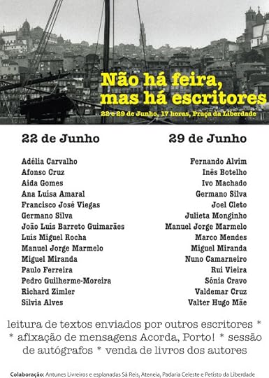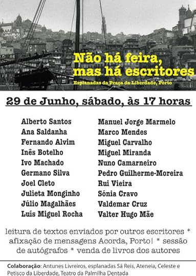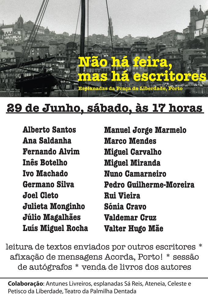 o meu abô num sabia que um dia os senhores espertos nos iam tirar a feira, mas num tiram mais nada, num senhor, e o meu abô até ia à Lamiré lá em cima na Rua da Alegria dos Azeitonas entregar instrumentos e dizia sempre para o senhor só pagar quando pudesse, assim o meu abô, que era honrado e tinhas contas à moda do Porto, ia ber este deserto nos Aliados e habia de dizer assim: podem tirar as barracas dos libros, mas num nos hão-de tirar a alma e tu bai lá, filho, tu senta-te na mesma com os teus escritores e fala de quando binhas para cá pequenino e te punhas naqueles prepósitos encostado às paredes de granito das casas da biela do anjo, de pé e de bruços encostabas-te às paredes de granito e lebantabas os braços e gritabas "O Porto é meu, abô, o Porto é meu!" e eu dizia-te sai lá daí, mas num queria nada, num queria nada que saísses, faz assim agora meu filho, lebanta os braços encostado a uma parede da praça e diz outra bez "O Porto é meu, abô, o Porto é meu, abô!", num há feira, mas há escritores, num há feira, mas há escritores. E digam lá se pode ou não comer-se o Porto! Num pode! Bibó Porto! "PG-M 2013foto de Lourdes Costa