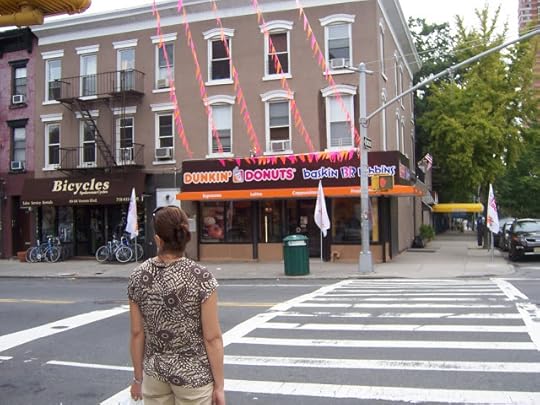 Precisamente. Dunkin' Donuts. Na esquina da West 37th com a Broadway. Fazem um café excelente. Talvez o melhor café que uma pessoa pode levar num copo de plástico para uma conversa volante. É servido com a consistência e os espaços certos. Se eu fosse um cientista, talvez o soubesse explicar melhor, mas sou só um padre.