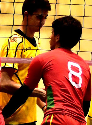 This story I have to tell. Álvaro Gímeno and Guilherme Moreira, the best absolute scorers of the Torneo Navidad 2016, Álvaro with almost 4 sets only to his account, Gui with almost 3. For those who like volleyball, volleyball seriously, and know that it is not about victory and defeat, but on small private stories and great public duels, know we watched several on the night of the second Spain-Portugal (3-2). I would like to highlight two, among many: the appearance of Manuel Meirinho. For a kid who came from scratch as a volleyball player two years ago, it was remarkable the claw and the effort of overcoming in this game - in the 5th and final set, he drawed the game alone, recovering from 0-3 to 3-3 (some kill blocks and spikes at one meter and those "ronaldian" war cries that mobilized the all team - "siiiiiiiiim" (yes!) and "eu estou aqui!" (I am here!)).. The other was this, between the fantastic player who the spaniard Álvaro already is (deadly in the service, powerful and intelligent in the attack, effective in the block, anyway, everything, and we ask he is kept like this :)) and the aspiring ace to be so good as he, the gentleman of honor :), my Gui. Álvaro won, but the most beautiful was the fight, particularly the way Guilherme was shining to receive those deadly services. At the end, the image documents it. It is not a banal compliment in the net: