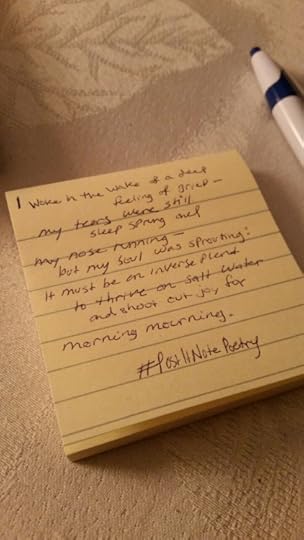 Day 23 - 25 Poems in 25 Says I woke in the wake of a deep feeling of grief- my tears were still sleep -sprung and my nose running- but my soul was sprouting: It must be an inverse plant to thrive on salt water and shoot out joy for morning mourning.