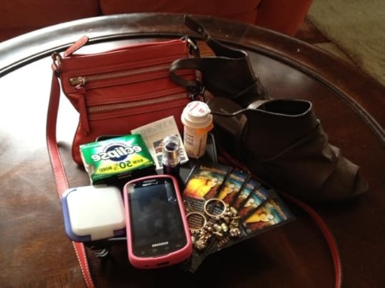 1. Pink lipstick, Cover Girl #415 and a compact,since I was sixteen, actually2. Shoes that make me feel like a rock star (I cando ANYTHING with the right shoes!)3. Bookmarks for any of my books (Spellbound, atthe moment)4. Gum (only spearmint, never, never, evercinnamon)5. Dangly earrings that jingle in my ears (theydon't even have to match anything I'm wearing at the moment to make the cut)6. Migraine medication ( because the headachedoesn't care how busy my day is)7. My Iphone, not as much for calls than foremails, (and the notebook function that lets me jot notes for books as theycome to me, as they do, all day long, plus the recorder function, for the samereason)8. Stamps (sometimes I carry them so long theyexpire and I need more, but I always have them)9. Sunglasses, big round ones like Jackie O my hubshates (sorry hubs, I lurve them!)10. A small purse that goes around my shoulder. I despise big purses that look more like amine shaft, and those small ones with such a short strap they snug up into yourarmpit.
