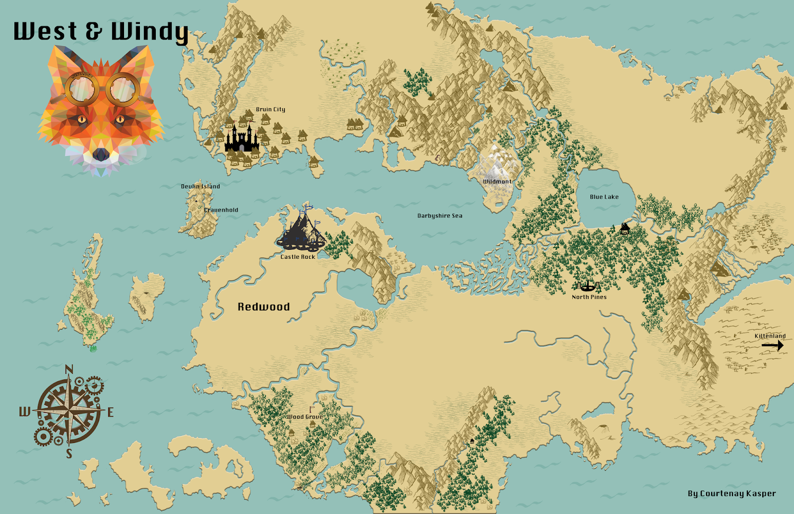 Brief description of the world or location you created for this story: West & Windy live in Redwood which is a continent in the world of Forestia. Redwood has many different climates and landforms: the obsidian cliffs of Castle Rock, the frigid mountain town of Wildmont with its impassable weather patterns, and the underground city of Blue Lake.