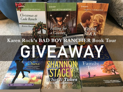 - 1 winner will receive print copies of CHRISTMAS AT CADE RANCH and FALLING FOR A COWBOY by Karen Rock, WISHES AT FIRST LIGHT by Joanne Rock, A SKY FULL OF STARS by Samantha Chase, WHAT IT TAKES by Shanon Stacey, and FAMILY TREE by Susan Wiggs (US only)