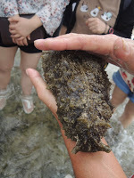 sea cucumberWe joined a group of a couple dozen Taiwanese tourists down at the beach. The tour guide, who spoke only Chinese, led us around in the shallow water and picked up various sea creatures to tell us about. I was thankful to be wearing water shoes as they had recommended ahead of time but wished my shorts were shorter, since they were soon drenched.