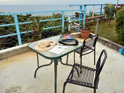 the place where what you've just read got writtenFinding a stationery store, I went in and purchased a thin notebook and two pens. Then I rode around a little longer, back on the coastal road, sure I would find just the right place to stop and write. I ended up taking a narrow turn-off that led me to a scenic spot where there happens to be a little glass-topped table and a couple of fairly comfortable chairs. It's the perfect place! I've been sitting here for almost two hours now, listening to the surf and recording my simple adventures so far.