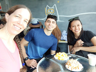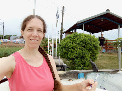 We rented scooters and found the place we'd arranged to stay, called A-Road Bed and Breakfast. Turns out it isn't even officially open for business yet, but somehow we'd been able to get a reservation. I love my little room there -- as far as I can remember, though I've been blessed with opportunities to travel a lot, this may be the first time I've ever had a hotel room all to myself anywhere. It has two beds with duvets, a place to hang up clothes, its own little bathroom, and the all-important air conditioning. And a TV that I have no intention of using. The door opens to the outside, and there are two little translucent windows that there's no point in opening unless you want a view of a wall about eight inches away, or a water tank. The complimentary packets of drip coffee that awaited me on the mini-fridge when I arrived are labeled "Coffee n Fins", which is the name of the coffee shop right next door. I especially appreciated that there were not only two little bottles of water for me, but a special faucet in the room for drinking water. (I've already used it to refill those two bottles plus my original one multiple times.)