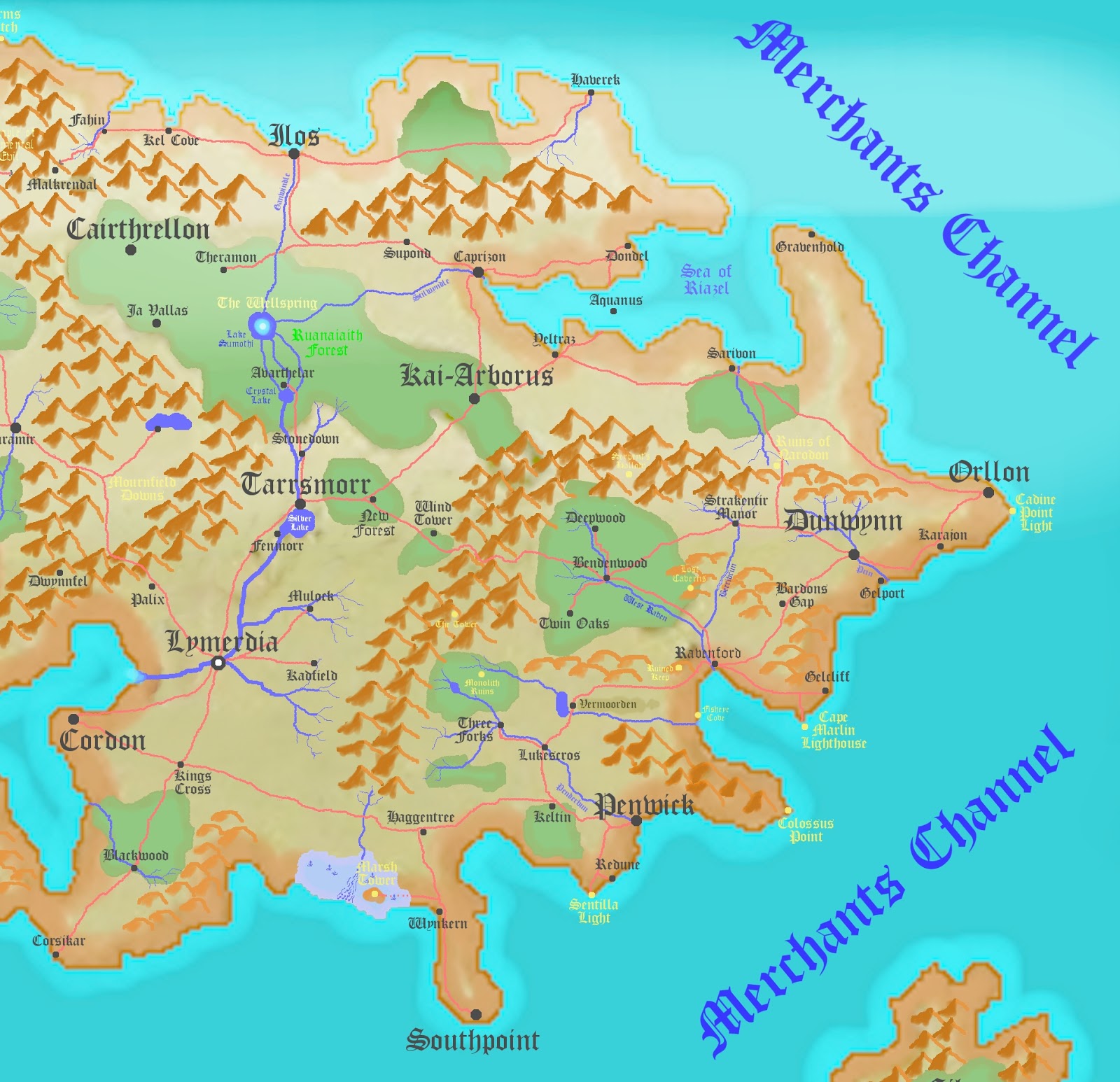 The island continent itself is divided down the middle by a towering wall of mountains that practically reach up to the sky. They are aptly named the Thertassels, or ‘Sky Wall’ mountains by the elves.