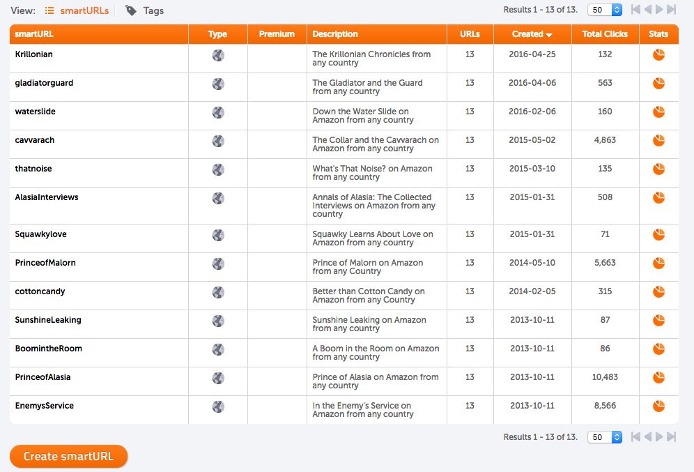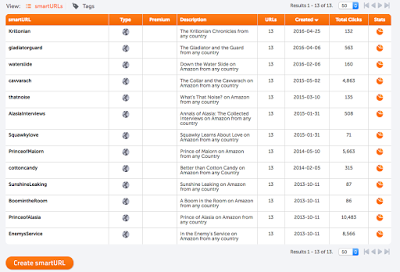 10.) After that, you'll see a button at the top right in the black bar that says "my smartURLs". If you click on it, you'll see the one you just created, with a "Create smartURL" button at the bottom that will let you create more. Here's what my screen looks like, with all the smartURLs I've created for my various books: