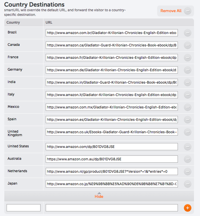 6.) It's possible that the site will then automatically fill in the names of more countries and your book's address in them. However, it may not include them all. Check back on your Bookshelf to make sure every country with an Amazon store is really represented in the list. If not, click on the orange circle with the + on it, to the right of the URL bar back on the Smart URL site. It will open up a spot for you to do fill in the information again with a new country. Keep doing it until you've entered the information for all the different Amazon stores.