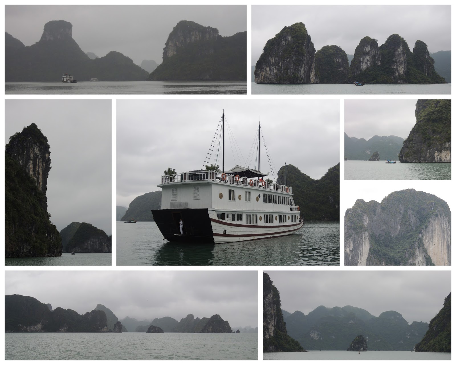 The center picture in the above collage shows our little cruise ship; the others show the scenery around Ha Long Bay. This gorgeous area is a UNESCO World Heritage Site.