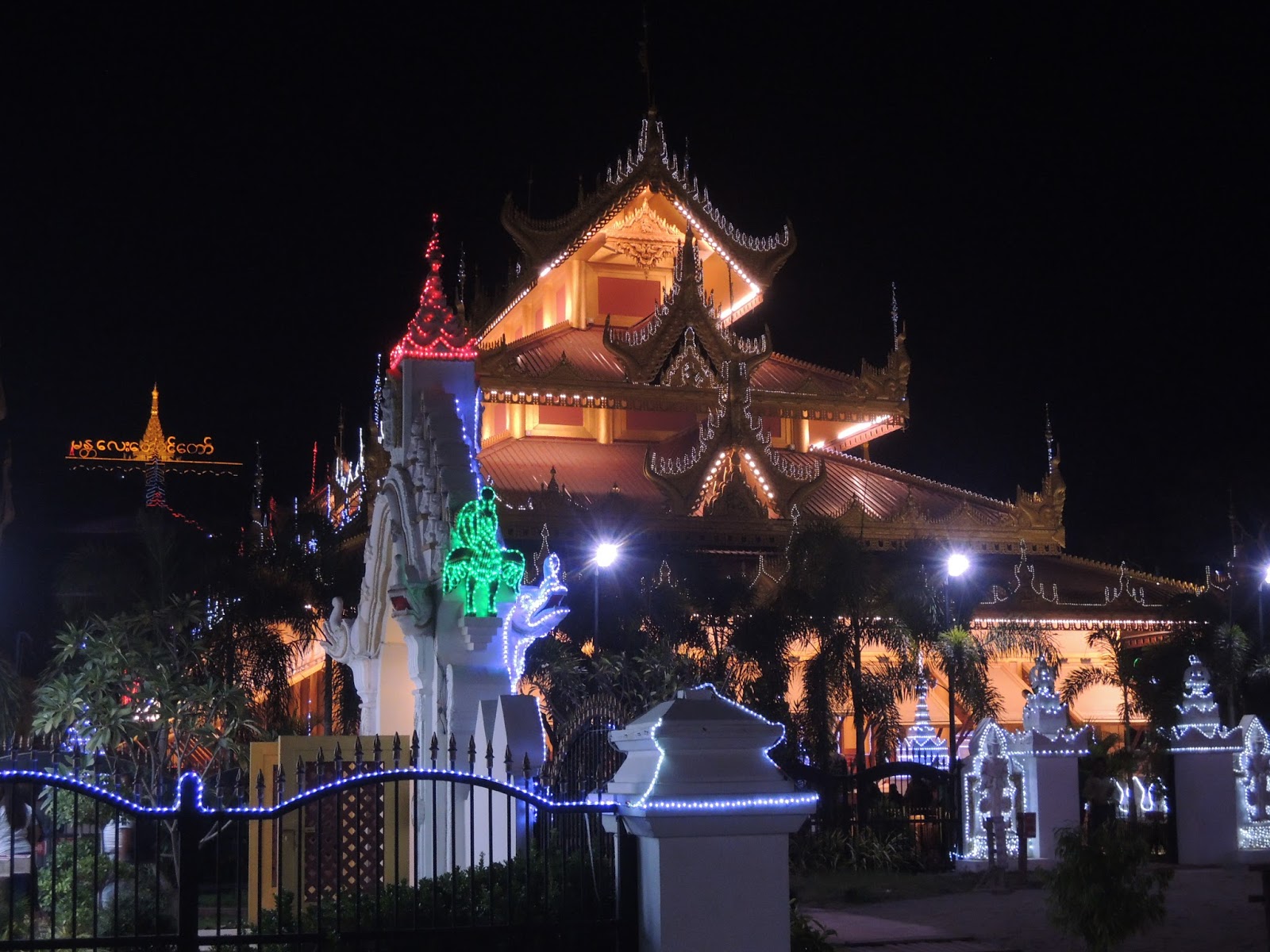 Eventually (after dark) we ended up on Mandalay Hill, where there's a set of temple buildings so lit up with colored lights that we both thought they looked like something you'd find in Disneyland. But no, they're active centers of Buddhist worship.