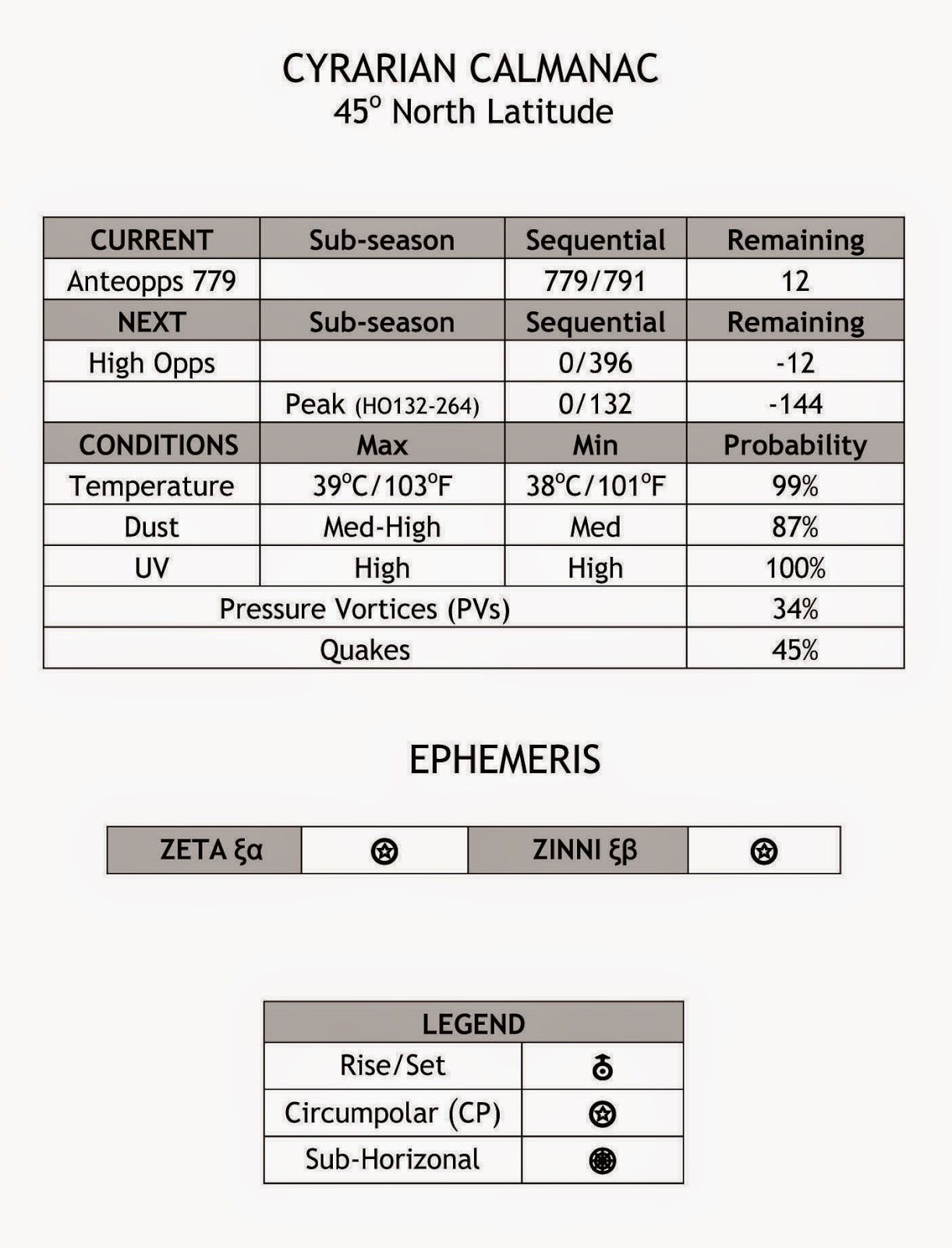 Due to the extreme climate on the surface during certain seasons, suitable protective clothing is required depending on the locale. Transportation may also be limited during severe weather.