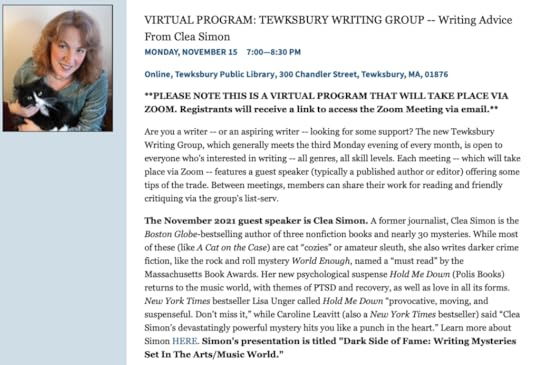 I am thrilled to be speaking to the Tewksbury Library’s ongoing interactive Zoom writing group. I’m going to be talk a little about using the arts and music scenes as a setting, but then we’ll be open for questions about everything from plotting to pencils. Please tune in and have your questions ready!