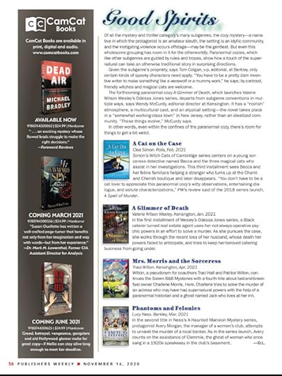 “Clara, a small calico cat with the magical power to shade herself into invisibility, has the big job of watching over her human companion,” this review (in the January issue of Booklist begins. “Cat-loving cozy fans with a taste for the paranormal will find a lot to like in this third in the series.”