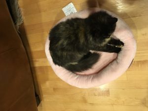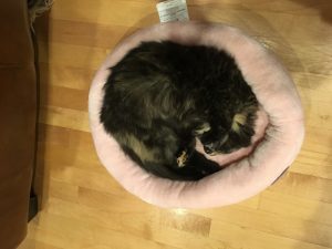 One of Bouchercon’s traditions is its auctions – usually a live one and a silent one, which raise money for a literacy campaign. This year, the beneficiary was Dolly Parton’s literacy campaign, the Imagination Library. , which provides books to kids. And so, to contribute, I put together a “cat box” of cat books. And, yes, I briefly considered putting them in a cat – litter – box. Better sense prevailed and I instead packaged them up in a pink plush cat bed. But in the few minutes that the bed (safely stored in my car until I was ready) was in my house, being packaged, Thisbe found it – and claimed it as her own. The deadline to contribute was approaching, and so I packaged it up anyway, feeling the guilt that only a cat lover can know. And on my return, I got her a (seemingly) identical cat bed. And she rejected it! I was being punished. Until today….