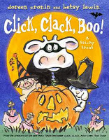 Click, Clack, Boo!: A Tricky Treat- Antheneum Books for YR.by Doreen Cronin, Betsy Lewin -Farmer Brown does not like Halloween. So he draws the shades, puts on his footy pajamas, and climbs into bed.