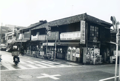 One of the most saddening locations for me is the little crossroads between 2-33 Nezu and 2-3 and 2-4 Yanaka. In my last post I showed a snapshot from 1987 showing a line of lost buildings at 2-33 Nezu, here's another photo of the same buildings.