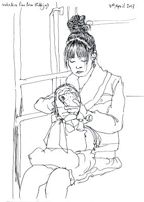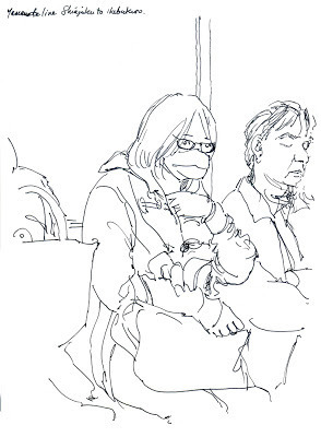 On this trip in particular I drew a lot of train passengers. Daughter and I were staying in familiar territory near Tama Plaza on the long Den-en-toshi line, which snakes from Chuo Rinkan in Yamato through the northern suburbs of Yokohama to the great hub of Shibuya, from whence it evolves into the Hanzomon line and continues eastwards through the middle of Tokyo. It takes around half an hour to travel on the express from Tama Plaza to Shibuya, but with the popularity of the suburbs beyond the Tamagawa river it's becoming increasingly difficult to get a seat, especially on the express even outside rush hours. It was often only when I caught the slower trains that I could sit and sketch.