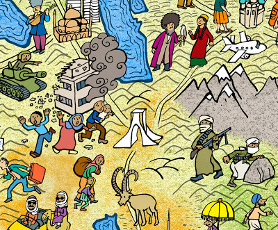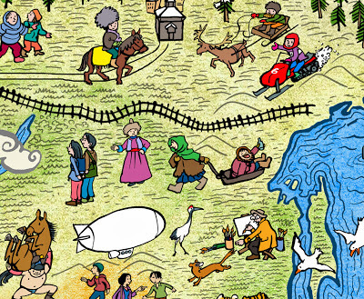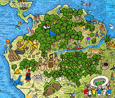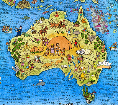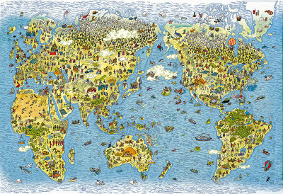 As anticipated, there were many editorial changes right up to the last minute, even after I delivered the finished artwork, figures were taken out or replaced, enlarged or reduced (especially Japan - I was sad to see my Ainu man was removed from Hokkaido!). Also, at the very last minute the client decided to greatly lighten the colours, my original watercolour textures were smoothed out to a much flatter finish. Hmm, I personally prefer the deeper colours you see here, but this was a commissioned piece and my job is to provide what the client requires - in these instances, the client is always right!