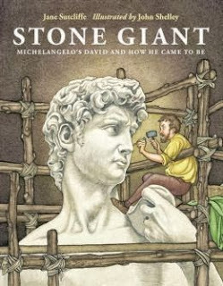 As the title indicates, Stone Giant is a non-fiction picture book telling the story of how the statue of David was first commissioned and an enormous block of marble cut, but after some limited attempts by obscure artists the project was abandoned and the flawed stone left forgotten and abandoned in a stonemason's yard for over 40 years. Finally the young Michelangelo came along to carve the statue and create one of his greatest masterpieces.