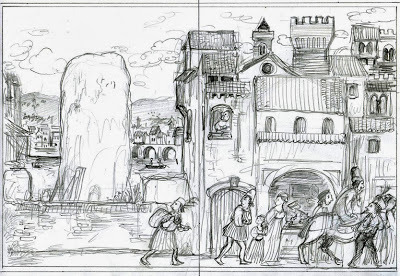 My main sources were later images by Giuseppe Zocchi showing an oblique view of the old Loggia dei Pisani, the wall of the merchants (demolished in the 19th Century), and another by Bernardo Bellotto showing a glimpse of the church of San Romolo, also long vanished, pulled down in 1769. Using these references and a few others I was able to plan out, turn around and draw in a series of sketches of the buildings from a completely different angle. This felt like real historical research, I hope the experts are satisfied!