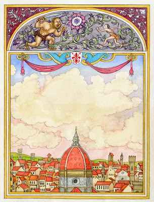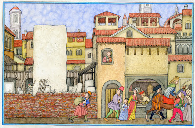 Then there is the town. I'm quite familiar with modern Florence, but one of the biggest challenges was depicting the city as it appeared at the beginning of the 16th Century. This climatic spread was a particular conundrum, as I wanted to show a specific scene as Michelangelo would have known it, but virtually all of these buildings were demolished after Michelangelo's era, and there are very few references.