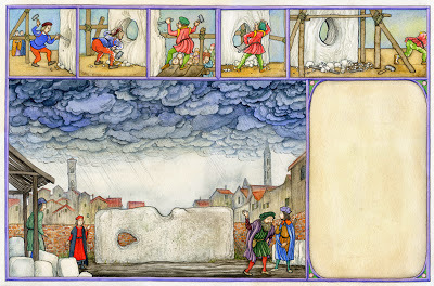 Another challenge was the depiction of Michelangelo at work on the statue. I based my stone cutters yard loosely on a painting by Canaletto, with a good dose of conjecture. It's known that Michelangelo built a wooden shed around the stone to protect it while he worked and keep out prying eyes, however experts don't entirely agree how the statue was carved - was it laid out at an angle or carved upright, or flat? I used my imagination to fill in the gaps and settled for the most striking visual appeal, this is how he may have worked, we'll probably never know the actual truth.