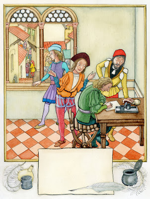 Therein lies the problem of research using old paintings - they can never quite tell the whole story, only glimpses through the eyes and materials of the original artist. So when you're looking for authenticity, often the more you find, the deeper you have to look in order to "nail it", to reassure yourself that you've got it right. It's easy to spend entire days chasing references for some minor detail, at some point you have to stop searching and start drawing, so unless you're literally copying an image (not recommended, the facsimiles above are an exception!) then there will always be need to cross-reference, invent, re-interpret and imagine parts of a scene. The resulting illustration is therefore a matching of your imagination with that of the artists' you source.