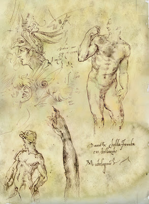 I wasn't afraid to use the ultimate device: line-for-line facsimiles of Michelangelo's sketches. Oh, the impertinence! I wanted to show his work of course, but it had to be in the same pen and watercolour as the rest of the spreads, so I tried my hand at reproducing his work with my own materials. These were drawn in homage to the master, I hope the ghost of the great man will rest easy!
