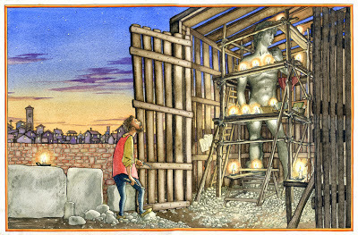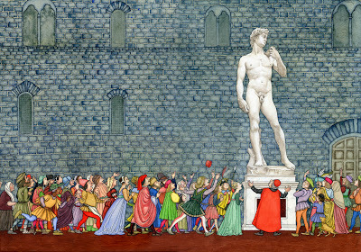Stone Giant - Michelangelo's David and How He Came to Be, written by Jane Sutcliffe, has been my biggest illustration project of the last year. Although the book was commissioned from the US, the first version to hit the shops is in Japanese - in order to tie in with a major exhibition of Michelangelo's work at the National Museum of Western Art in Tokyo, Komine Shoten have fast released their edition of the book in advance, it's now on sale throughout Japan. The originally commissioned English language edition from Charlesbridge in the US will be out next spring (ISBN: 978-1-58089-295-7), but is already available for pre-order from your local independent bookshop, or Random House, Amazon, Foyles, Barnes and Noble and other online sites.