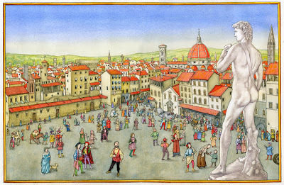 The statue in this illustration is elevated much higher than it actually stood - that's a deliberate compositional device I make no apologies for! But the rest of the image is an attempt to show the Piazza della Signoria as it was, facing away from the Palazzo Vecchio, with the cathedral in view. However virtually all contemporary depictions of the square are facing the opposite direction towards the Palazzo Vecchio and Loggia dei Lanzi, away from the more run-down west side.