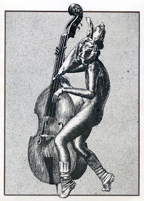 Having graduated from Manchester I moved to Norwich, where my parents had decided to re-settle during my absence. Rural Norfolk was a complete contrast to Manchester. I knew nothing about Norwich at all, but there was a burgeoning music and arts scene which I slipped into pretty quickly. With virtually no budget I started anonymously publishing an indies music/arts fanzine The Blue Blanket, through which I interviewed bands, touring and local, ran local event listings, plus there were odd features on the arts, and opinionated flippant essays under various nom-de-plumes. And of course it was fully illustrated with my work. It was fun, made me a bunch of friends very quickly, and invariably sold out. Somewhere along the years of multiple housemoving I lost my own remaining copies, so I've only memories of the magazine now, but recently I did find one piece of artwork in my dad's house.