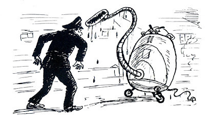 The book is sheer pantomime farce, the story of an evil vacuum cleaner that takes on a life of its own and goes on the rampage. Growing bigger and more powerful the more it slurps, Fatbag trashes the town, chased by the completely ineffective police and fire brigade.