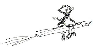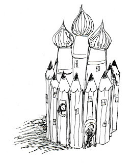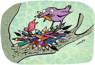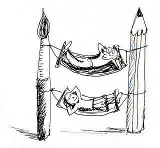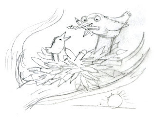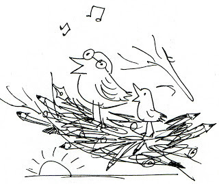 Still, I wasn't altogether comfortable showing straight representations of Seren and myself. Then a simple little idea popped up from a succession of associations [Home = nest] [nest = twigs] [twigs = pencils!]