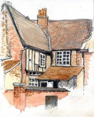 Next was a rear view of one of the iconic buildings in Elm Hill. It was very tempting to draw the shop fronts, but they've been visualised so many times by hundreds of artists, I wanted to avoid the trap of rendering tourist scenes. The view behind the buildings on the other hand is a jumbled clutter of historic periods, reflecting how the formerly run-down medieval street was saved from demolition in the 1920's. I began this with a pencil drawing, intending to just drop in a light wash of colour, but as often happens with me the paint took over and buried the under drawing, one reason I tend to prefer pen and ink over pencil for sketching!