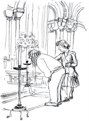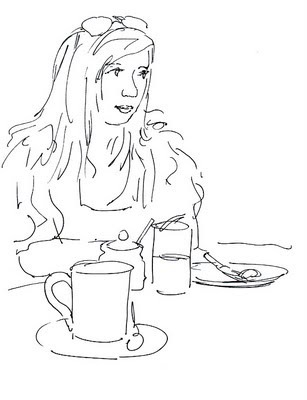 In a similar way I was attracted to this scene as the shadowed screen door frames the figures. In reality several people passed through the door while I was drawing, but this mother and child lingered just long enough for me to loosely scribble them down.