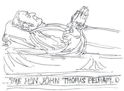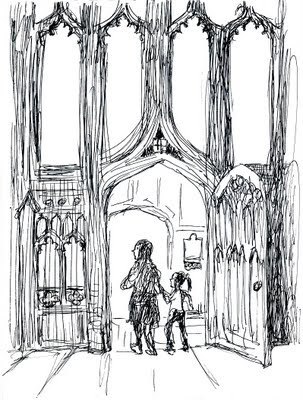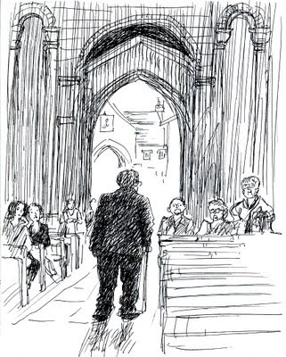 This rather frail looking tour guide appeared almost monolithic as he was rendered almost completely in silhouette by the light from the West Door, which my scribble only partly indicates.