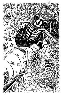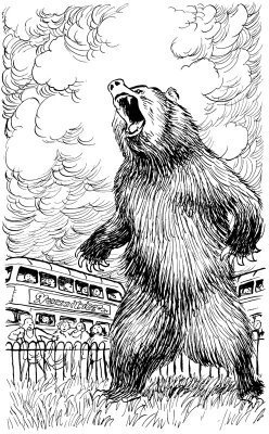 The Book consists of a series of comic horror tall tales related by a woman first met by the narrator in a London pub. Among other things a giant flea infesting the Underground, belligerent wasps in the middle of winter, poisonous burgers, mouse hypnotising, and a runaway grizzy bear, lots of fun to illustrate.