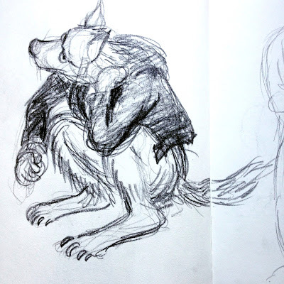 From a sketching exercise run by illustrator Adam Storey at the SCBWI Retreat - we were asked to loosely sketch the outline of volunteer models, then develop the sketch into a character - here I turned attendee Gary Fabri into a wolf-man.