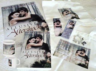 *******************************************Now for the GIVEAWAY!!Whatâs up for grabs? 1 Signed paperback copy of Allusive Aftershock1 Coffee Mug with Allusive Aftershock full print cover1 Charm Bracelet with Allusive Aftershock book charm, created by Cassie Chaves of Cassieâs Crafty Creations1 Tote Bag with Allusive Aftershock front and back cover1 Poster of Allusive Aftershock book cover, 11â by 17â2 Winners of an e-book copy of Allusive Aftershock