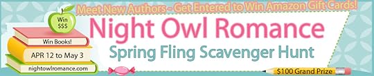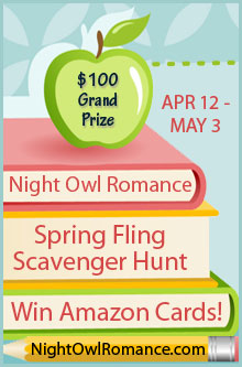 Hi Readers,I've got a special treat for you. I'm on of the sponsors of the Night Owl Reviews "Spring Fling" Scavenger Hunt, April 12 - May 3. During this event I'm going to help you find some great new books.Make sure to check my featured title, Wet Kisses, out along the way.37 AUTHORS100+ WINNERS